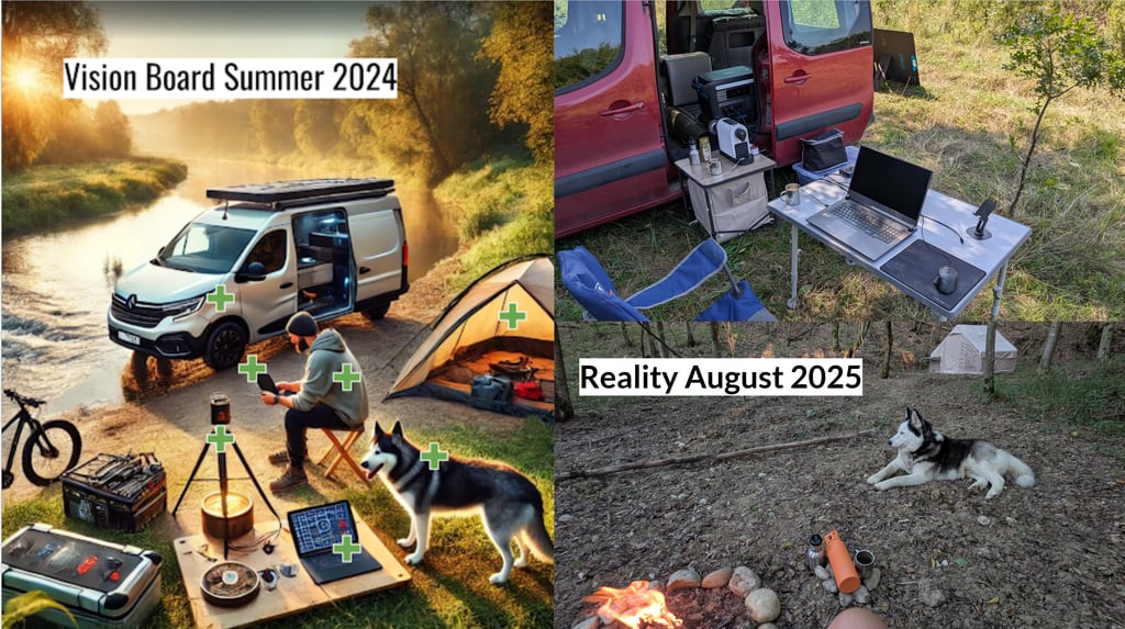Links: Eine KI-generierte Vision. Der Wunsch nach einem mobilen, autarken Arbeitsplatz, der die Verbindung zur Natur nicht kappt, sondern vertieft. Ein Setup für den digitalen Pionier, der gleichzeitig Eremit ist.